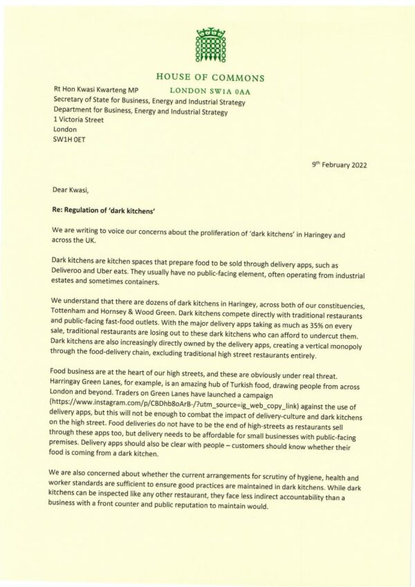 Dark Kitchens – letter to Secretary of State